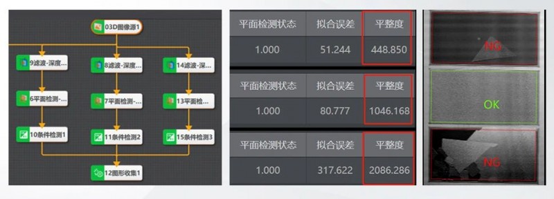 针对叠片和碎片缺陷检测,VM 3D软件中,深度图像分别定位到每个硅片位置,统计每个硅片位置ROI内平面度,根据平面度情况判断硅片是否存在破碎和叠片。