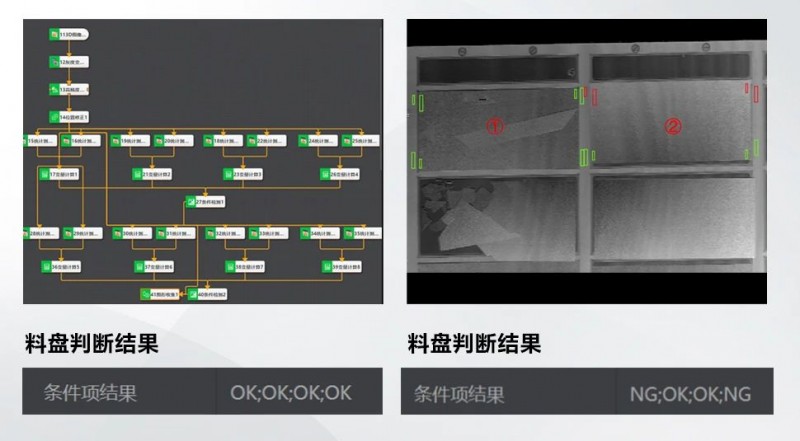 针对搭边缺陷检测,基于相机采集的深度图像,导入VM 3D软件中,依据mark点定位到每个料盘的四个角点,分别在角点料坑上下曲小区域计算均值,可取四对或八对区域,比对料坑上下高度差值,正值为OK(绿色非搭边框),负值为NG(红色搭边框)。