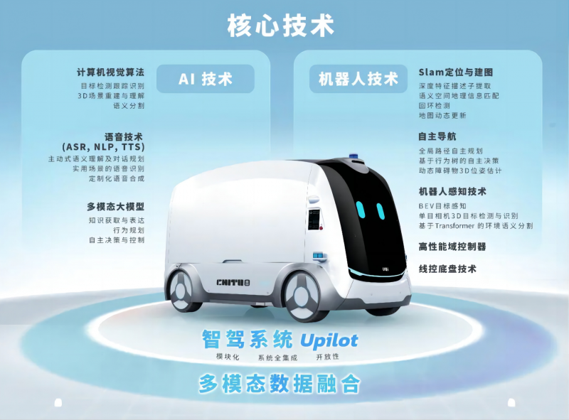 据了解,Chitu赤兔还搭载了UQI优奇自主研发的智能驾驶系统Upilot,并融合计算机视觉算法、语音技术、多模态大模型、SLAM定位与建图、自主导航、高精度感知等“AI+机器人”技术,达到国内先进的L4级无人驾驶技术水平。