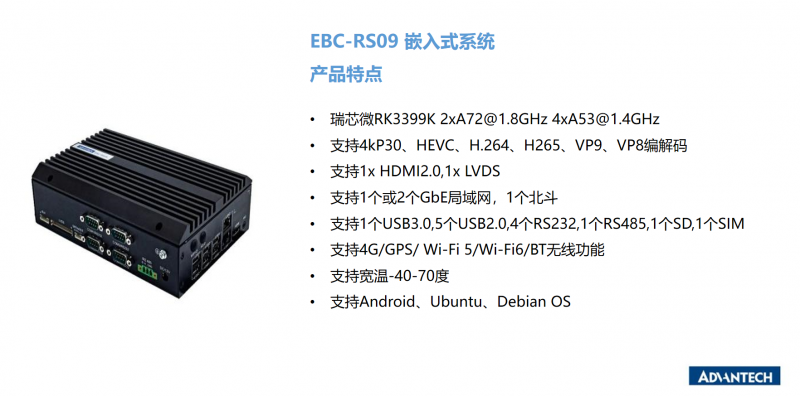 研华EBC-RS09是一款超高性价比的RISC嵌入式边缘AI智能系统,搭载高性能瑞芯微RK-3399 6核心处理器,具备丰富的I/O及扩展能力,广泛适用在自动化,医疗,零售等行业中!