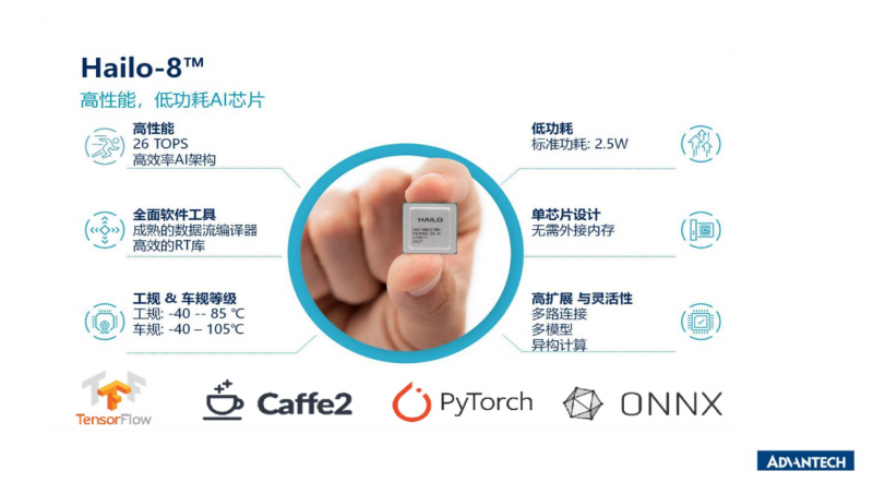 该方案采用Hailo-8高性能芯片,同时可支持Tensorflow Lite、Caffe、PyTorch、ONNX等多种AI框架,计算能力高效。