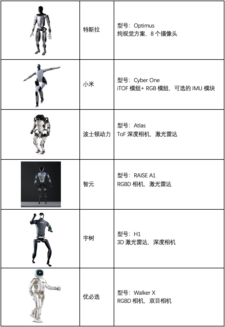 市面上主流的人形机器人通常配备先进的机器视觉系统,结合多模态感知能力和AI算法,实现环境理解、任务执行、安全和避障等功能。以特斯拉的Optimus人形机器人为例,它搭载8个摄像头的纯视觉方案,通过算法处理图像,实现物体识别、环境理解等功能。而其他机器人,如小米的Cyber One、波士顿动力的Atlas、智元的RAISE A1、宇树的H1以及优必选的Walker X,通过3D视觉和其他传感器结合,实现对环境的感知功能。