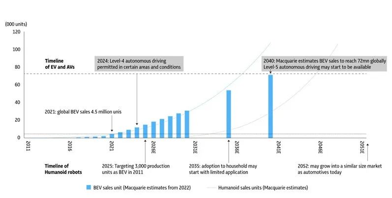 人形机器人渗透率曲线将与纯电动汽车相似。