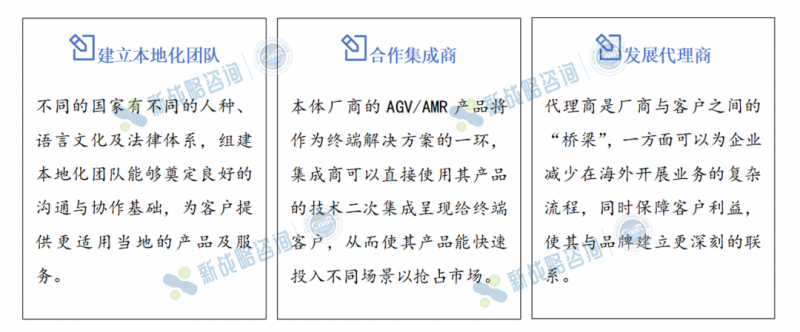 从市场布局来看,当前中国AGV/AMR企业海外主要目标市场主要包括欧洲、北美、日韩和东南亚等地区。这些地区对移动机器人的需求量较大,且市场增长迅速。而国内各家AGV/AMR企业布局海外,其进入模式主要有以下三种: