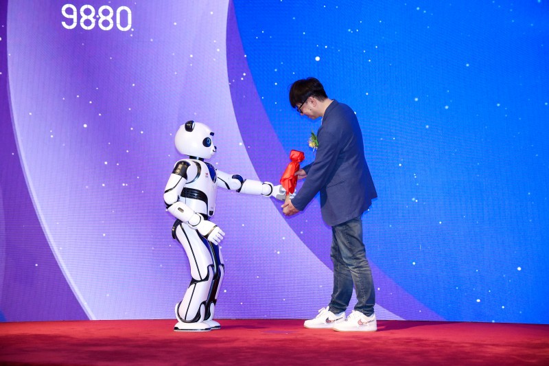 图片2:熊猫机器人优悠将锣锤递给优必选董事会主席、执行董事兼行政总裁周剑