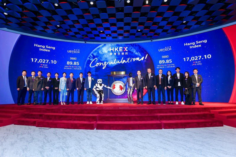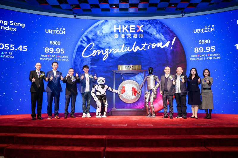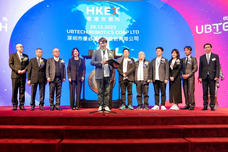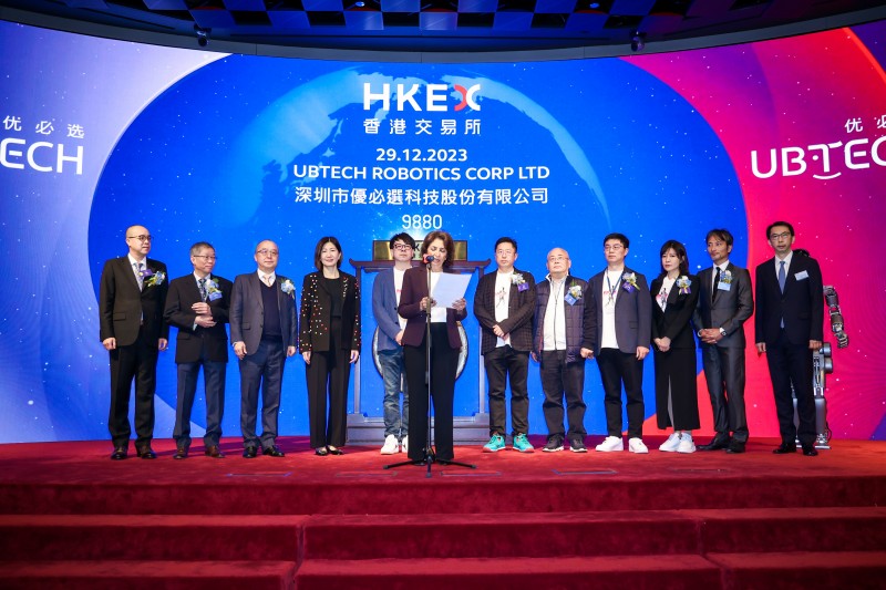 12月29日,优必选(股份代码:9880.HK)正式在香港交易所主板挂牌上市,股价最高达91港元,对应市值约380亿港元。香港特区政府创新科技及工业局局长孙东、香港特区政府引进重点企业办公室执行总裁吴国才,香港联交所上市委员会主席Renu Bhatia,香港交易所联席营运总监陈翊庭,优必选董事会主席、执行董事兼行政总裁周剑等出席上市仪式,共同见证人形机器人第一股的正式诞生。