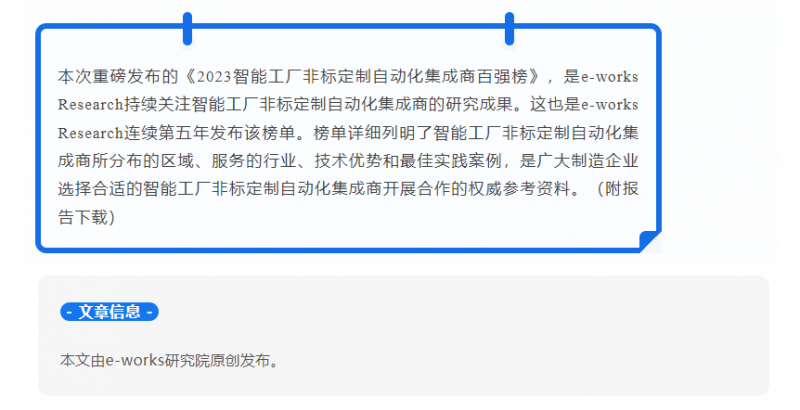 近日,e-works重磅发布了“2023智能工厂非标定制自动化集成商百强榜”,上海企业荣占十席,轩田科技榜上有名。此次是轩田科技继2022年再次上榜,连续2年跻身中国智能工厂非标自动化集成商百强行列!