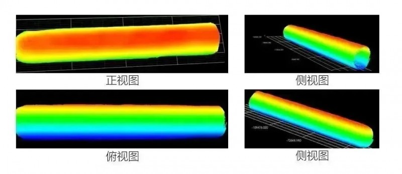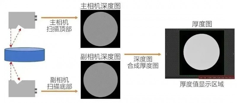 方案优势:通过双相机对射拼接扫的方式描圆柱体两个面,输出圆柱体“厚度”图像(两张深度图差分形成),在“厚度”图像中可直接显示圆柱体任意点位的厚度值,以及两个平面的3D数据