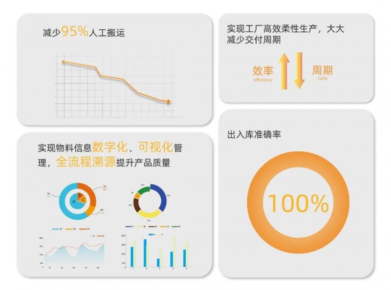 方案实现了对仓储信息和产线订单的全流程数字化管理,提高了信息的准确性和配送的及时性;物料信息全流程可追溯,大大提高了产品质量管理效率。