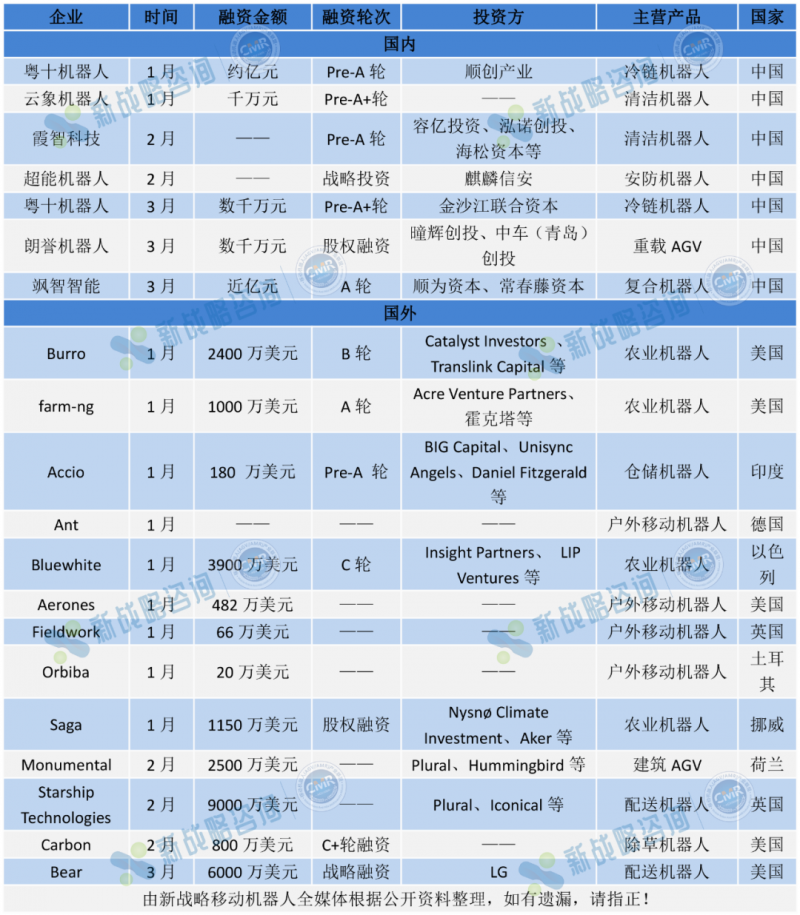 从时间分布来看,Q1全球移动机器人融资事件发生集中在1月,融资事件11起,融资总额约7.7亿元;2月出现较多大笔融资,融资事件5起,资金总额约9.1亿元;3月融资数量和融资金额均有所回落,融资数量4起,融资总额约5.5亿元。
