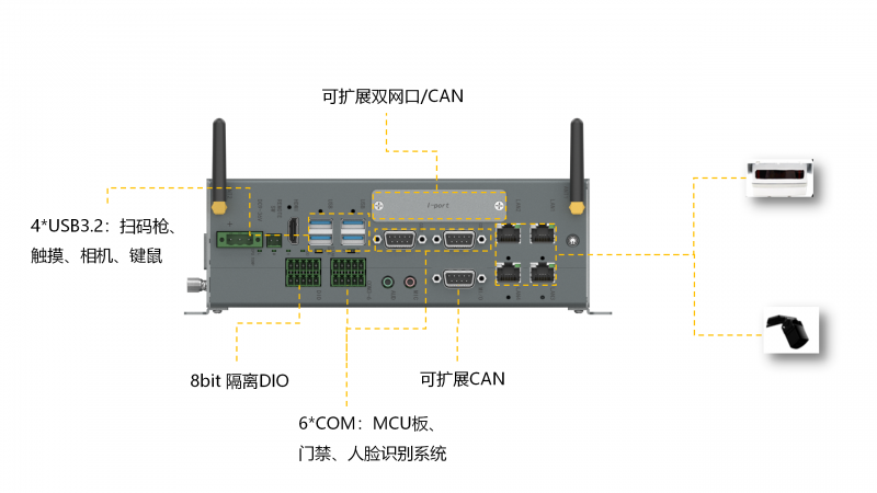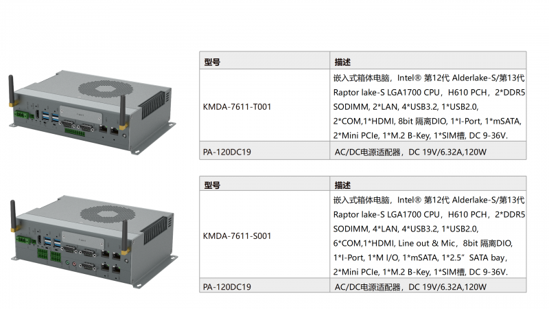 KMDA-7611是一款高性能箱体电脑,采用H610芯片组,搭载Intel®第12代Alder lake-S/第13代Raptor lake-S系列处理器,IO功能完整,体积大小适中,适用于无人叉车、机器视觉和工业控制等行业和领域。
