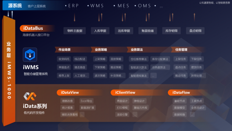 数智化解决方案少不了直观易懂、操作简便的人机交互界面。海康机器人为RCS、iWMS、MCS等软件设计了友好的人机界面,主界面总览全局,子界面分块详解,实时管控任务状态等各类数据。