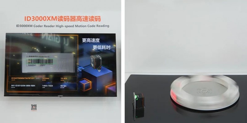 该系列产品选用优质的全局快门CMOS传感器和高性能硬件平台,出图帧率可达60FPS,结合深度学习算法,识读效率高。现场展示的是对转速10m/s以上物品进行读码作业,读码稳定,可轻松应对快消品包装、烟草、物流等高速运动读码场景。
