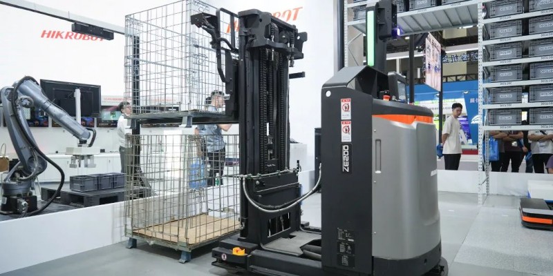 本次展会展出的是海康机器人全新一代的前移式叉取机器人,前移门架的设计,减少运载空间,提高运载速度。同时具备物料识别功能,可适配各种类型载具。取放精度高,支持物料自动堆叠和拆垛,提高作业效率。