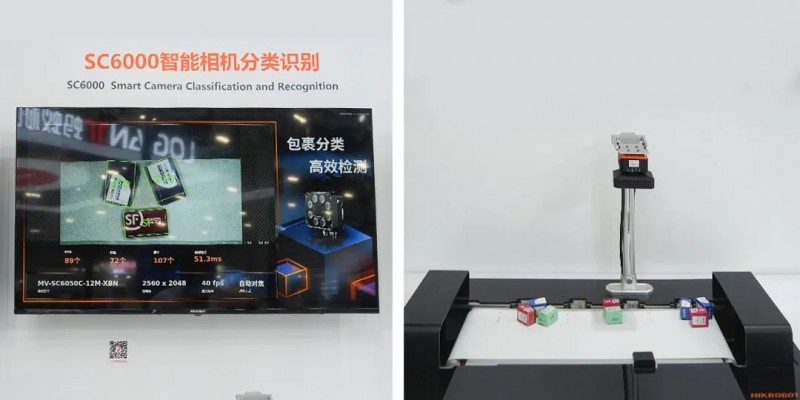 该相机采用高性能AI嵌入式平台开发,内置VM算法开发平台,多种通讯协议,场景适应能力强。现场展示的是SC6000对流通行业快递包裹进行分类识别,可准确对传送带上不同类别包裹进行准确定位和类别分类。