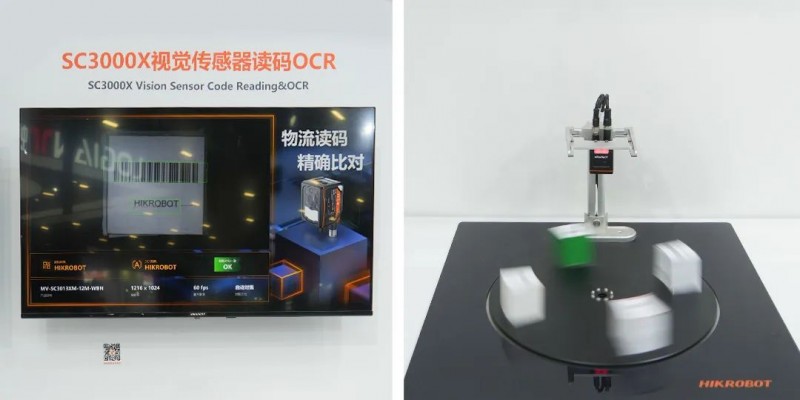 该相机集成像、算法、存储、通信于一身,内部嵌入了读码、有无、正反、测量、识别和计数等防错检测算法,充分保证信息读取的准确性。现场展示SC3000X对物流面单码和OCR的读取情况,即便面单在转盘上高速转动,相机仍可稳定读取作业,且对码和字符进行对比,是3C流通行业追溯信息的重要保障。