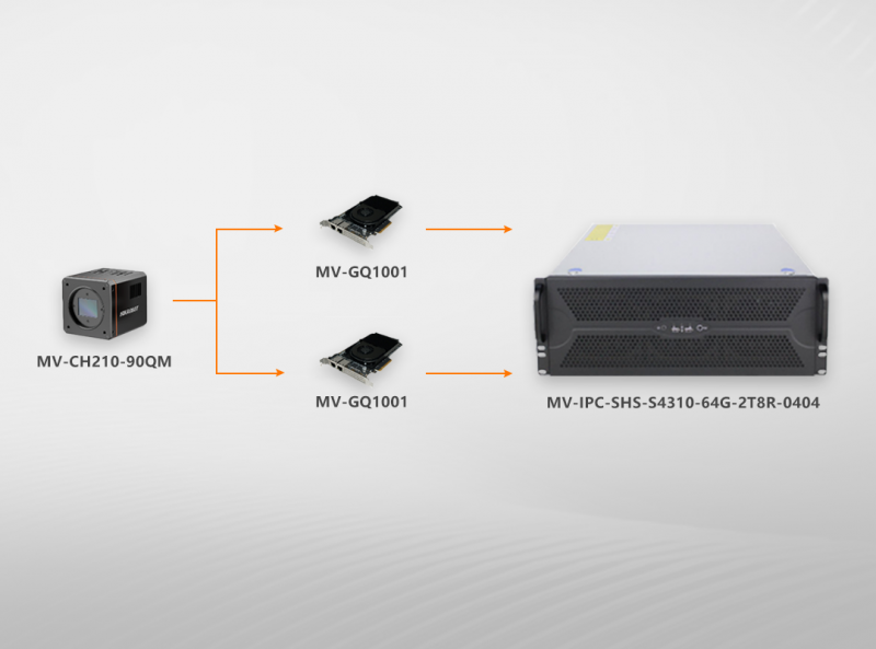 方案采用CH系列2100W分辨率/540帧面阵相机,通过2张50G单口光口卡GQ1001,将所有原图数据同步传输至14GB/s连续写入性能,16TB容量的SHS系列高速读写服务器中。