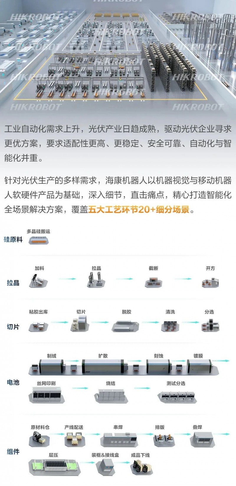 目前海康机器人已与包括通威、隆基、晶科在内的多家光伏头部企业在智能制造方面进行合作。智能化全场景解决方案在诸多光伏项目中落地应用。
