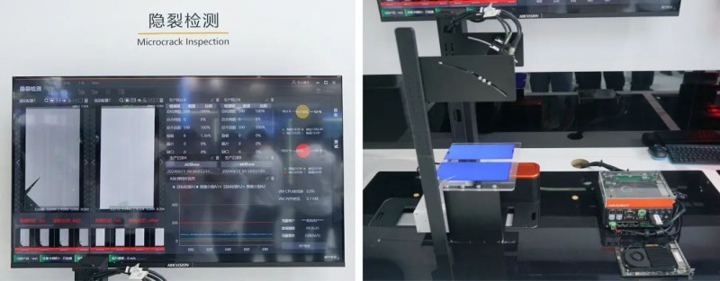 其中,隐裂检测方案使用“4k黑白线阵相机+大靶面短波红外镜头+穿透式近红外线激光光源”,可对0.5mm以上尺寸的脱晶、崩边、破片、隐裂以及叠片、脏污进行检出与分类;在数据处理上,采用了新发布的SVA智能视觉处理卡方案,将软件的大部分传统算法与深度学习检测模块转入这张采集卡内工作,极大降低了工控机的硬件资源占用。