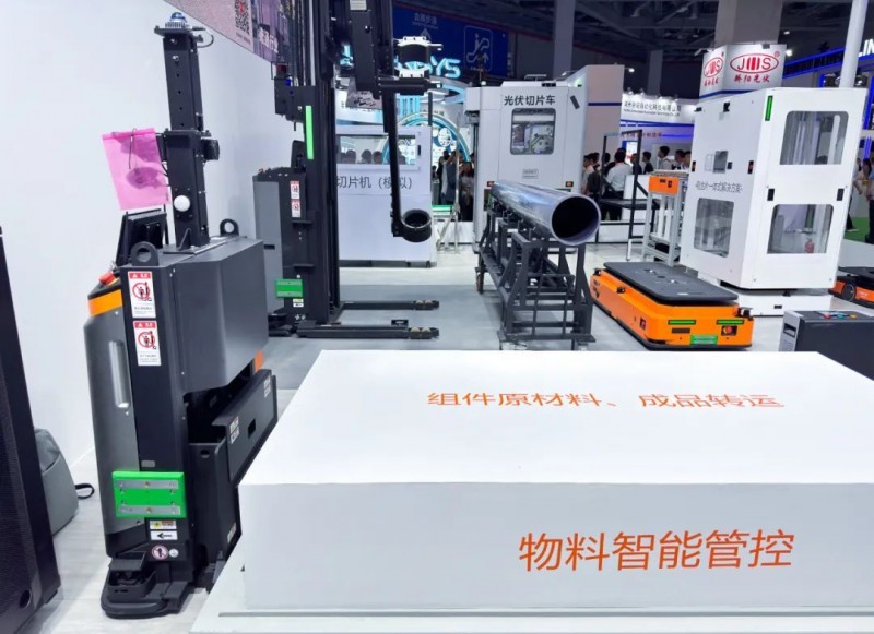 组件环节展示的是叉取AMR搬运托盘,对应组件工厂中的玻璃、EVA、电池片等原材料及成品转运。展示的叉取AMR可转运3T的物料,托盘长度可达2.5m,叉取AMR兼容多种规格托盘,且自动对接玻璃机、分档机、包装线等产线机台。