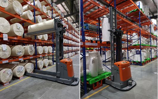 该项目共投入使用59台今天国际定制化AGV,包括三类38台激光导航叉车AGV和21台二维码导航的潜伏顶升式AGV,59台AGV共同运行在同一个车间里,协同工作,互不干扰。AGV系统在不同车型的车辆管理上实现了完美融合,真正做到了智慧物流。AGV应用场景包括原料、蛋糕卷、成品无人化、智能化精准搬运,实现了在高层货架的上下架自动搬运、平面仓库的自动搬运、以及半成品到使用车间的自动配送。