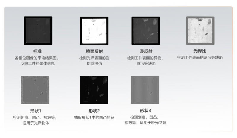 传统检测方案往往需要针对不同缺陷定制专用设备,不仅成本高昂,而且标准化程度低。而2.5D视觉技术则大为不同,它仅需单个光源就能同时检测多种类型的缺陷,且不受角度限制,这大大提升了方案的通用性和效率。更重要的是,一次拍摄就能输出多类型的结果图,从细小的凹凸到复杂的划痕,再到微小的脏污,展现了强大的复合检测功能。