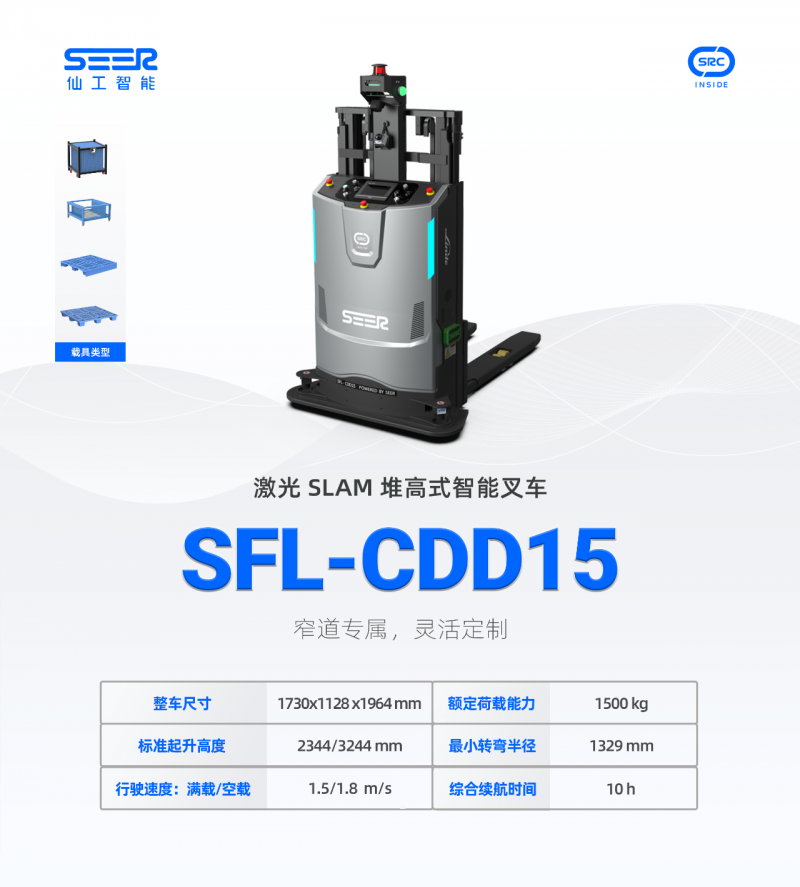 SFL-CDD15 基于林德车体打造,内置仙工智能 SRC 控制器,产品竞争力 Next Level。