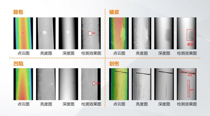 通过多相机环视拼接,可实现线缆/管材外表面点云数据的采集,通过VM 3D软件,可对线缆/管材表面鼓包、破皮、凹陷、划伤等缺陷进行有效检出。