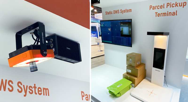 该区域展示了海康机器人静态DWS方案:在物流信息收集过程中无需人工干预,可以自动收集基础数据,适用于多种类型(如黑色、高反光、薄片、异形件等)包裹的体积测量。