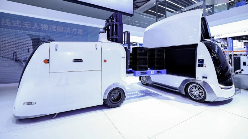 在CeMAT 2024展会现场首次展示的全栈式无人物流解决方案中,人形机器人可以与无人物流车、无人叉车等工业移动机器人和智能制造管理系统协同完成分拣、搬运和配送任务。人形机器人Walker S1接收UPilot移动机器人操作系统的物料转运任务,依托多模态大模型获得定位和语义信息,从货架上分拣物料至周转箱中。Wali瓦力顶升移动机器人U600将分拣好的周转箱运送到指定中转位置,由另一台人形机器人Walker S1将周转箱搬运到托盘上。接着,Wali瓦力重载无人叉车F3000自主导航到转运点,将托盘从地面叉取并装载到L4级无人物流车Chitu赤兔的车厢内,实现室内外场景物流无人化的无缝衔接。