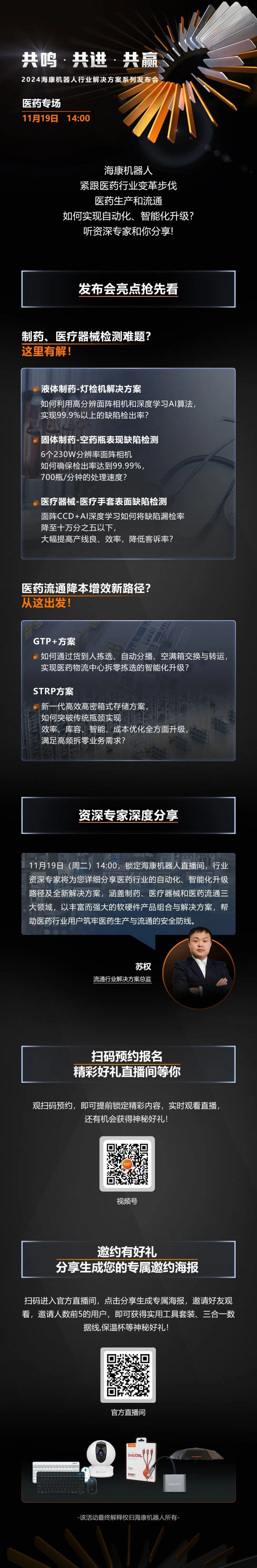 11月19日(周二)14:00,海康机器人资深专家将带来医药行业创新解决方案分享并进行实时答疑,分享官方直播间邀约海报、观看直播、填写问卷更有机会赢取多种精美好礼,即刻点击下方按钮预约吧!