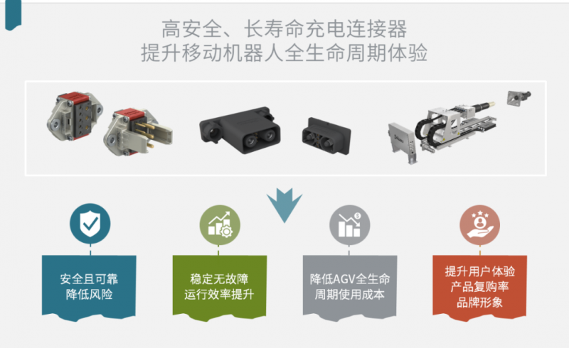 稳定可靠的充电连接器,能避免移动机器人充电故障,提高运行效率,降低维护成本,提升 ROI。同时,覆盖全生命周期的充电连接器,TCO更低。