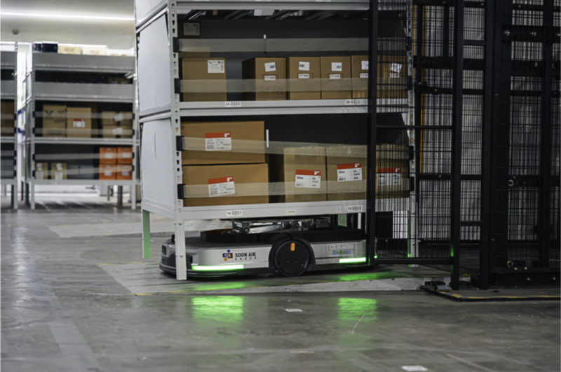 在Soon Aik 8 米高仓库中,30余台海康机器人 AMR(包括潜伏机器人 LMR 和料箱机器人 CTU)有序投入运行。这些 AMR 与Infolog 的仓储管理系统(WMS)以及海康机器人的机器人控制系统(RCS)深度集成,构建起一个高效智能的仓储物流体系。