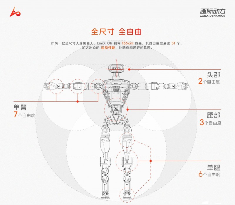 LimX Oli在这一点上没有选择“妥协式”的小尺寸方案,而是直接采用了165cm 的标准身高与31个机身主动自由度,构建出贴近人类躯体结构的通用人形构型。其自由度分布涵盖: