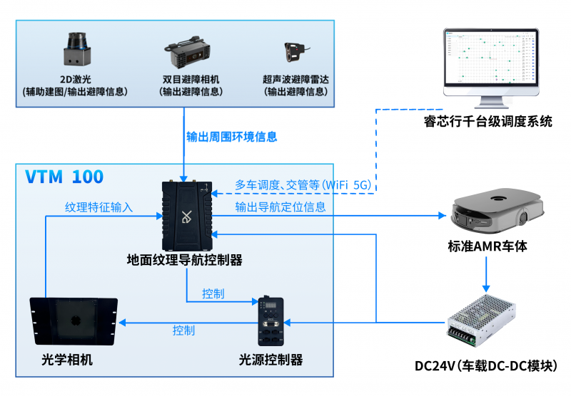 VTM 100(Visual Texture Module)是睿芯行推出的基于视觉的地面纹理导航模组。该模组由光学相机和地面纹理导航控制器组成,通过光学相机输出地面纹理特征,搭配地面纹理导航控制器产品实现无需地面任何标识物,输出定位信息。可支持瓷砖、水泥、金刚砂等材质地面,实现基于视觉地面纹理的导航定位。VTM100是标准化模组,可基于客制多款AMR标准车型,快速形成地面纹理导航AMR整车产品,可支持最高速度2m/s,定位精度±5mm,场景无忧,无惧白天黑夜。