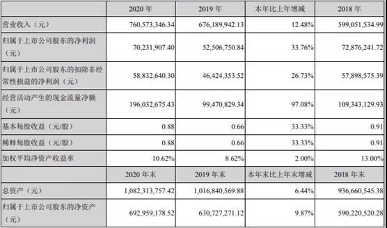 据宁波中大力德智能传动股份有限公司发布的2020年年度报告显示,公司2020年度实现营业收入 7.61亿元,同比增长12.48%;归属于上市公司股东的净利润7023.19万元,同比增长33.76%,扣除非归母净利润为5883万,同比增长26.73%。