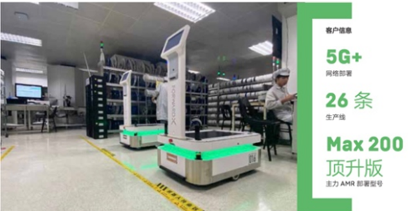 全球领先的某大型通信设备公司无线小基站智能工厂项目,迦智科技近百台自然导航AMR,在5G技术低延时、高带宽、高速率的传输特性加持下,实现了与用户现场的MES、WMS以及第三方设备间的互联互通,信息上传下达,交互协同作业。