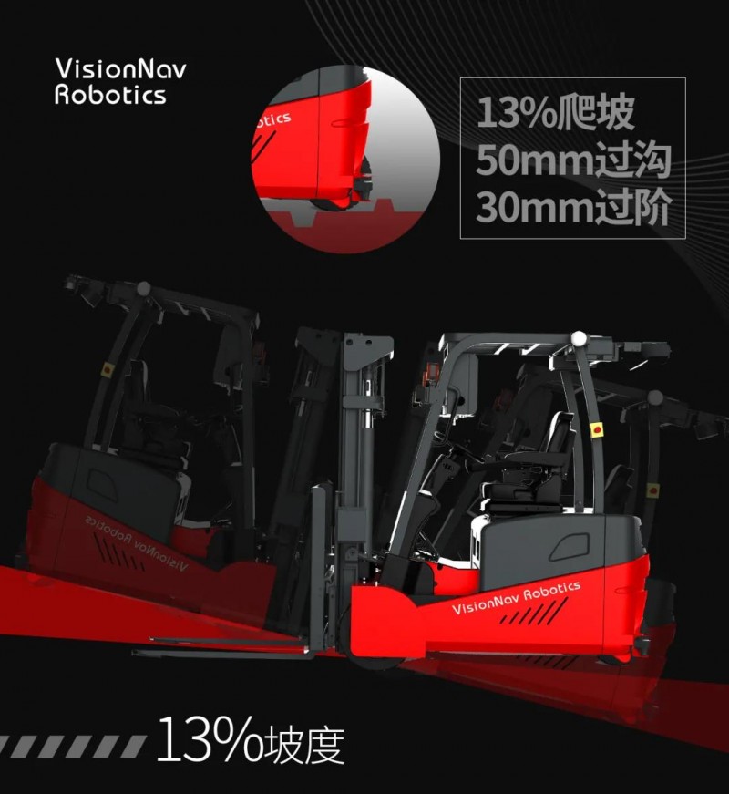 VNP20装载了450mm的高耐磨实心橡胶轮,实现13%最大坡度、50mm最大过沟宽度以及30mm最大过阶高度的越障能力,轻松应对外月台、室外等高速、高负载作业工况。
