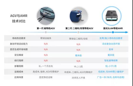 其实,AGV发展至今已经历了三次技术变革。行业内普遍依据导航方式的不同将其划为:第一代磁导航AGV,第二代二维码/信标导航AGV,以及第三代自然导航AGV,又称AMR(自主移动机器人)。