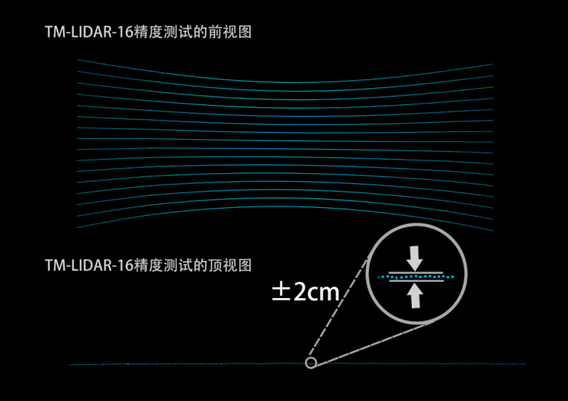 TM-LIDAR-16采用脉冲测距法,能抗强光干扰,且误差大小受量程影响较小,在150米以内,墙面精度控制在±2cm。
