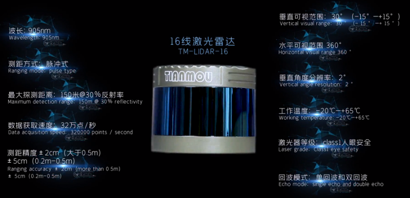 TM-LIDAR-16是一款16线机械式激光雷达,最大探测距离是150米,垂直可视范围是30°,水平可视范围为360°,垂直角度分辨率为2°。