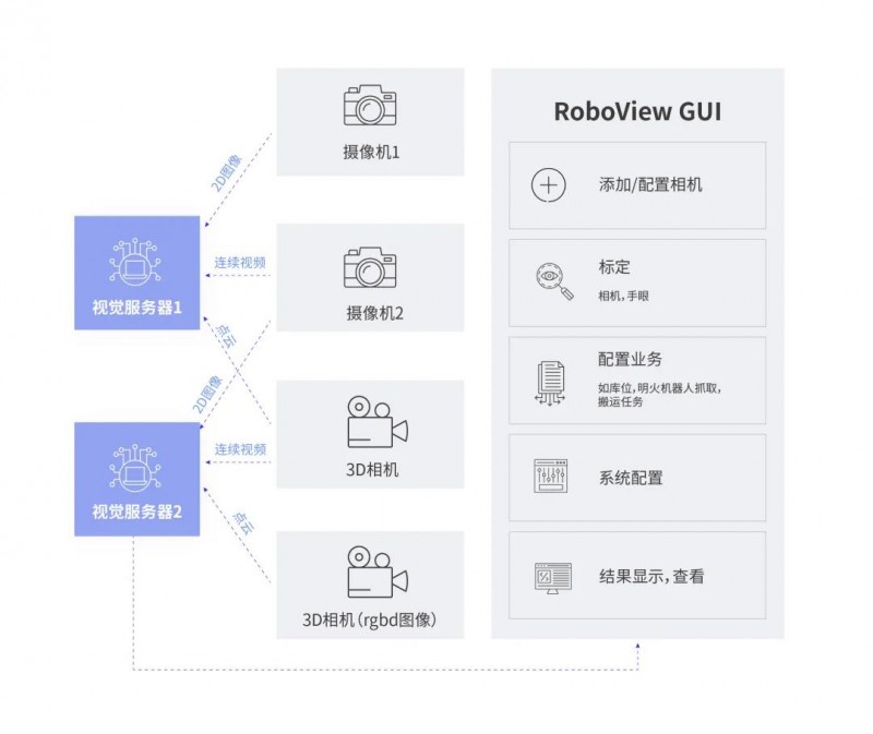 RoboView 视觉 AI 解决方案以先进的机器视觉算法为后台(RoboView Server),以易于操作和直观显示的界面软件 RoboView GUI 为前端,为客户提供覆盖生产、安全、管理等环节下的众多应用的视觉 AI 解决方案。