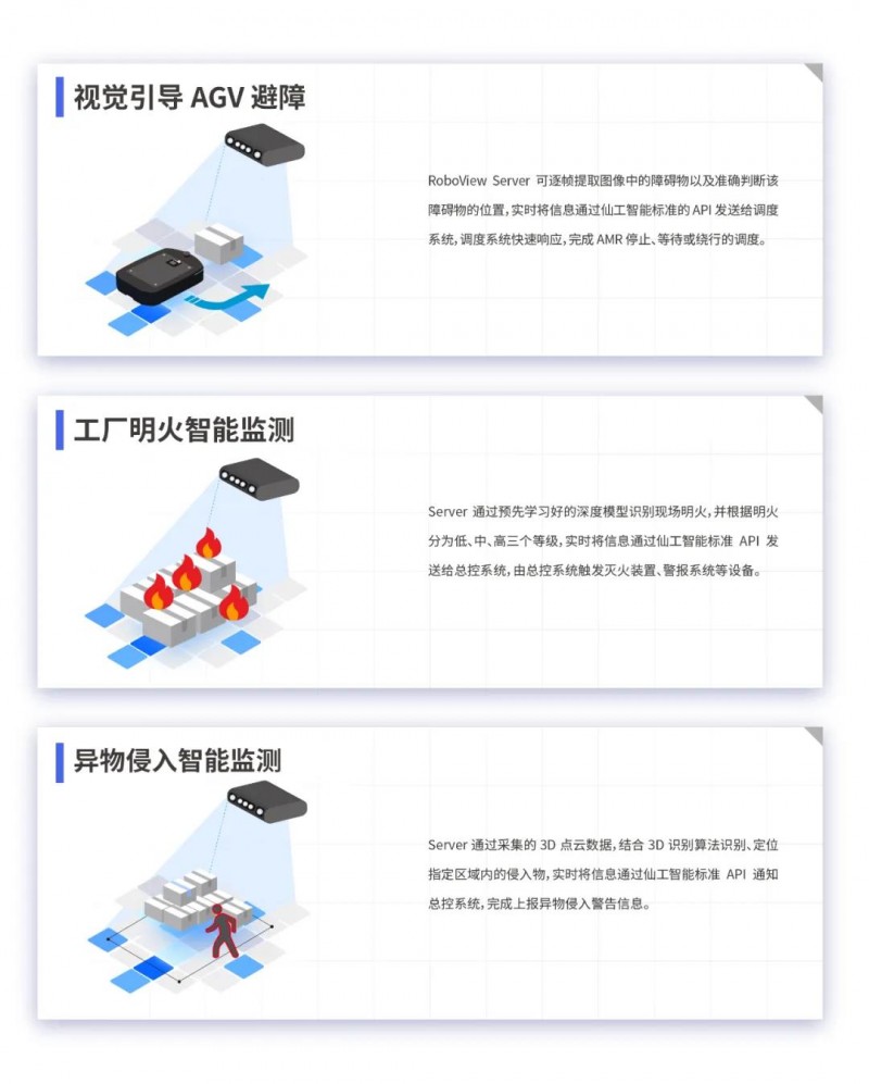 RoboView Server 通过摄像头实时采集的现场视频,经过不同的视觉算法判断现场情况,实时 通过仙工智能标准 API 发送给对应的调度系统或总控系统,以确保工作、生产安全进行。