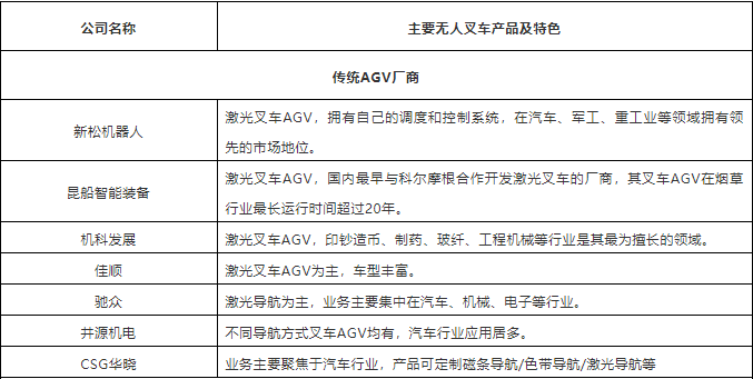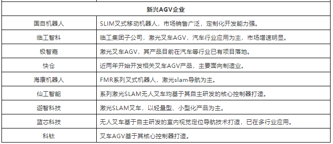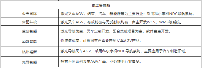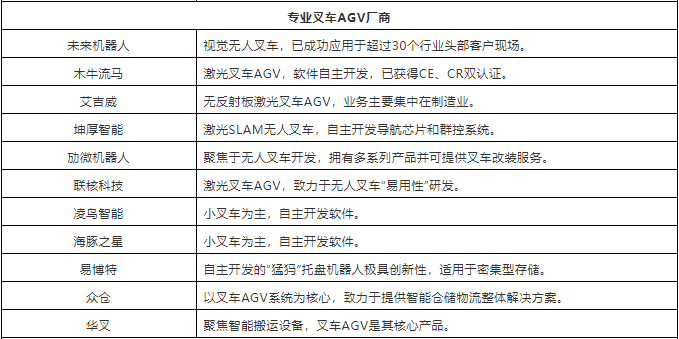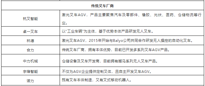 表:中国市场40+叉车AGV企业(排名不分先后,企业分类以其主营业务为依据)