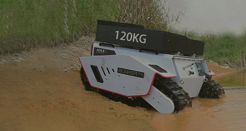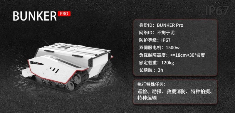 可以说,BUNKER Pro提供了在野外、箱涵、石泥路等高挑战性环境下最佳的移动开发平台,助力机器人行业和科研客户快速部署和开发特殊作业机器人,诸如巡检、勘探、消防、特种拍摄、特种运输等应用。BUNKER Pro外观结构全新设计,车身重心位置低,装置了1500W双伺服电机进行驱动,极具越野性。此外,其采用了克里斯蒂悬挂和玛蒂尔达四轮平衡多悬挂系统组合,并于全车安装了加强版避震器和防撞击结构组件,外观采用了高强度和大厚度的钢材,这为执行特种作业应用提供了可靠的减震系统性能。 目前,BUNKER Pro最高越障可达18cm,爬坡度为<=30°,这意味着面对野外坡道和厂区楼梯,BUNKER Pro都可以一举轻松爬越和稳定运行。BUNKER Pro驱动形式为履带差速转向和左右独立驱动,自研运动控制系统电机采用了2500线光电增量式码盘,可以在复杂道路中实现高精度的控制,并且可以柔性实现0转弯半径原地自旋。BUNKER Pro外观配置了防撞耐用的钢质结构, 且整车结构、材料以及外置电气元件均采用均采用高防护等级设计,达到了IP67安全标准,这是市面上同级别综合路况移动平台中防护等级最高的。其具备沙尘渗透防护、移动涉水和短暂浸泡防护(防浸)等优势,无惧任何潮湿、涉水、越野等极限工作环境,可以保证BUNER Pro极大拓展机器人的使用场景。基于高等级防护、模块化和精简部件结构设计,BUNKER Pro车体后期清洁也是十分便捷的,不藏污垢,不易腐蚀,易于维护。BUNKER Pro平台空间大,可以在原地自旋过程中达到120kg载重,这意味着可以轻松搭载各类检测设备。用户可通过CAN总线协议与主控通讯,快速接入传感系统,搭建自主应用开发平台,同时,BUNKER Pro也支持定制高级操作模式(远程驾驶/自动驾驶),提供开源SDK、ROS_PACKAGE。BUNKER Pro还具有大电池容量,可在常规路面载重120kg运行情况下支持3小时续航, 也可对搭载的传感器等外部设备进行供电, 为机器人应用的作业提供充足和便捷的运行保障。