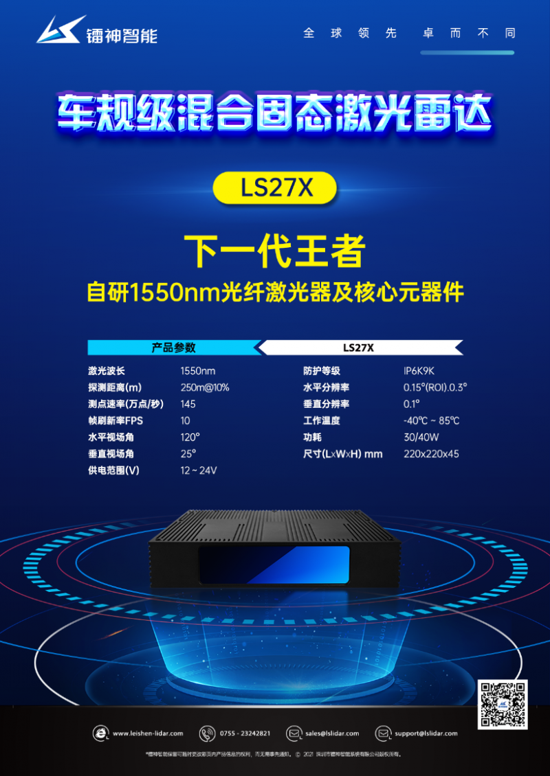 采用自研的1550nm光纤激光器和核心元器件的下一代王者——LS27X车规级混合固态激光雷达即将面世!