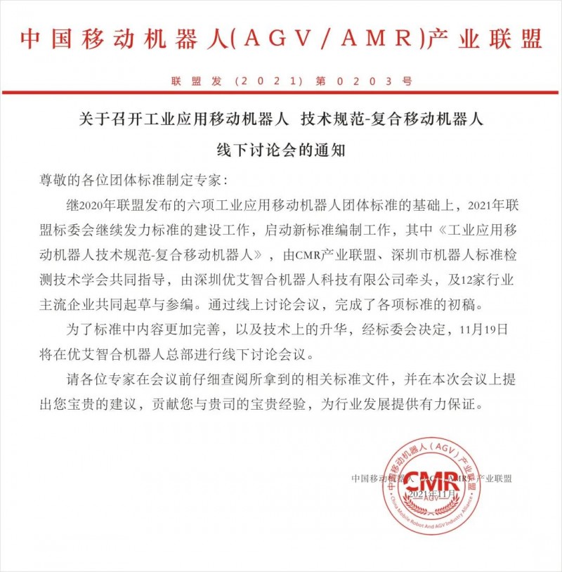 关于召开《工业应用移动机器人 技术规范-复合移动机器人》线下讨论会的通知