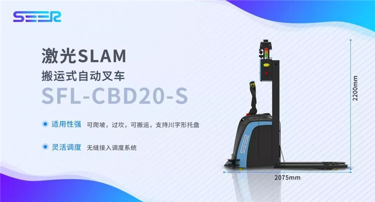 仙工智能激光SLAM搬运式叉车SFL-CBD20-S,最大负载可高达2000kg,可替代工厂内大负载多类型的搬运;支持系统介入,采用视觉AI,可栈板识别,精准叉货,并实现物料的精准取放和搬运;支持自主充电,并在充电运行过程中无需工作人员介入操作;可爬坡,过坎,过电梯,可搬运,支持川字型托盘,适应性强;