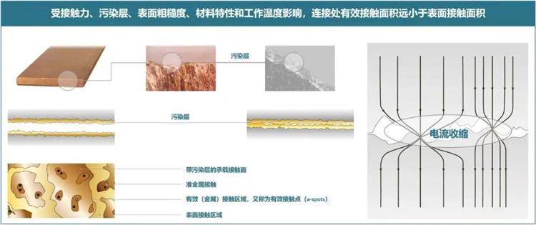 在所有接触不良火灾原因中,线路接头处接触电阻过大引起的火灾居于第一位。因此接触电阻大小直接影响着电连接质量,稳定的低接触电阻可以确保电连接长期安全可靠。根据电接触理论,金属接触表面在微观条件下总是凹凸不平的,同时受污染层(灰层、油膜、金属化合物)影响,电流通道集中在单个接触点,有效接触面积明显小于表面接触面积,看似面与面的连接,其实是点与点的连接,从而产生收缩电阻。同时污染层也会产生表面膜层电阻,最终导致接触电阻增大。