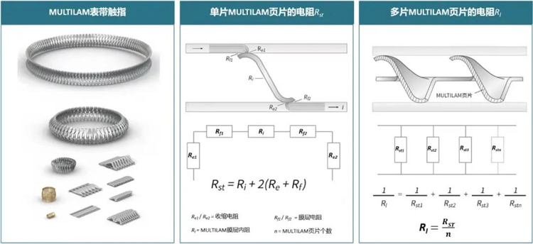 MULTILAM技术,也称为表带触指技术,即在两个接触面之间建立平行接触点,并且提供一定的接触力,可以破坏污染层,实现有效的电连接。每一个接触页片形成独立的弹性负载回路,通过一圈若干回路的并联,能大大减少导体之间的接触电阻。MULTILAM的接触电阻Rl相当于并联连接的接触页片的电阻。每一个接触页片的几何形状均为实现长久的工作寿命而设计。页片恒定的弹性压力可以使接触界面之间的连接保持稳定,从而实现恒定的低接触电阻。